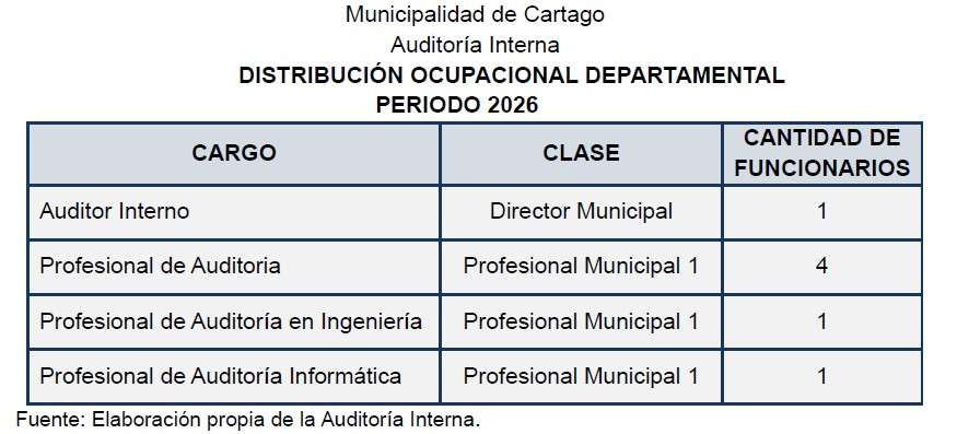 La estructura ocupacional de la Auditoría Interna se compone conforme al Manual de Clases y Cargos de la Municipalidad de Cartago; ambos aprobados en el artículo 1° del Acta N°105-2025 de sesión Extraordinaria celebrada el 05 de setiembre de 2025, de la siguiente forma: