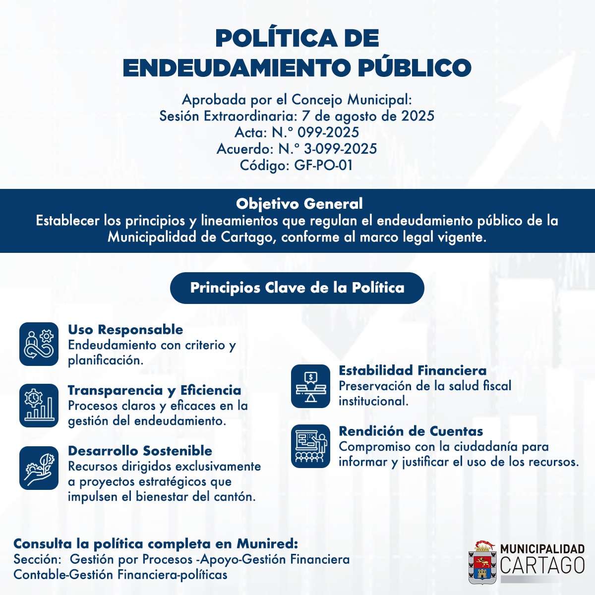 La política, ratificada mediante el Acuerdo N.º 3-099-2025 del 7 de agosto de 2025, tiene como Objetivo General regular el endeudamiento de la Municipalidad conforme al marco legal vigente, garantizando la salud fiscal de la institución.